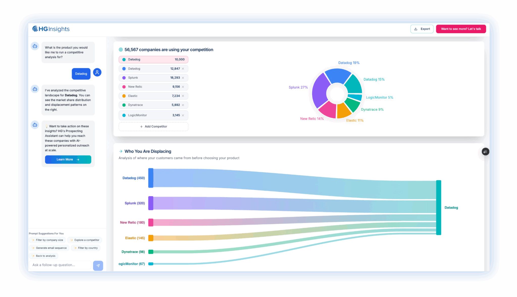 Access HG Insights' proven technographic intelligence, firmographic data, and company hierarchy datasets—the same enterprise data trusted by leading platforms to power AI features and product intelligence.